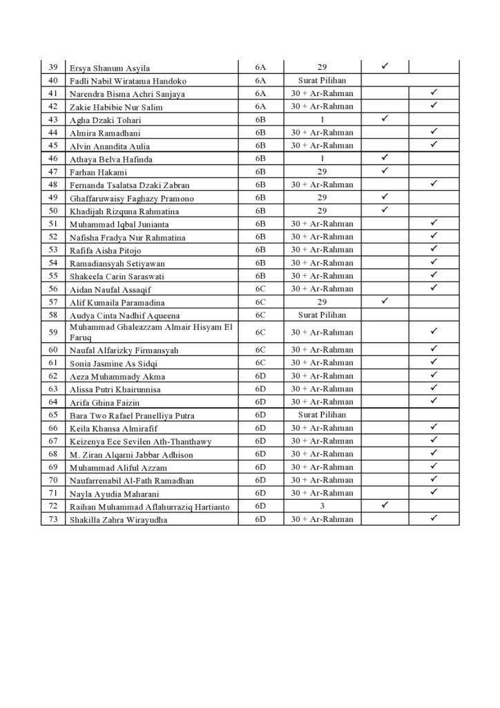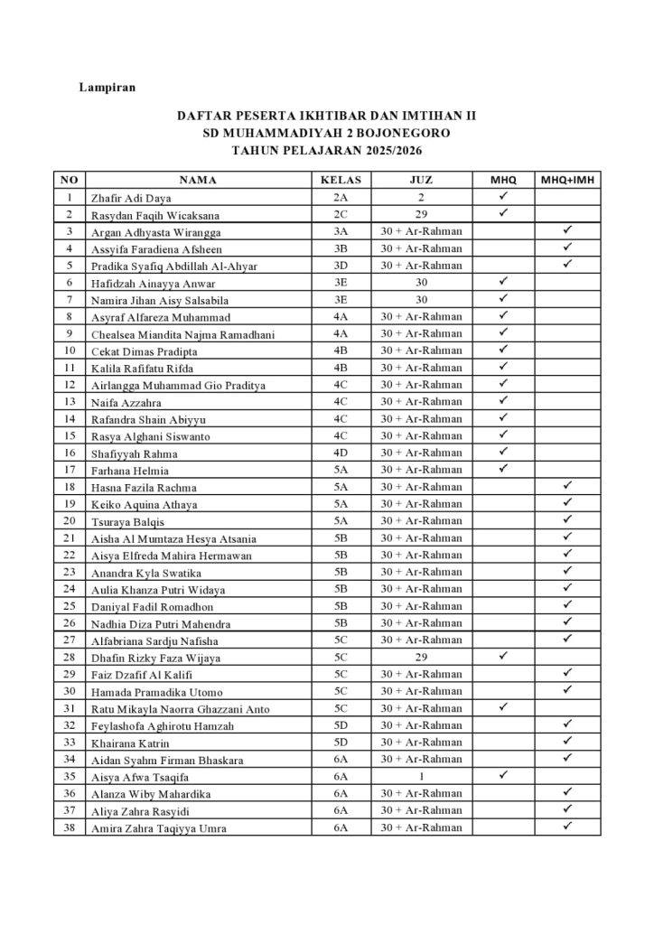 Para peserta didik ini tidak hanya menghafal juz-juz pendek, namun merambah ke target yang lebih luas dan menantang. Berikut adalah daftar hafalan yang akan diujikan pada proses Imtihan nanti: