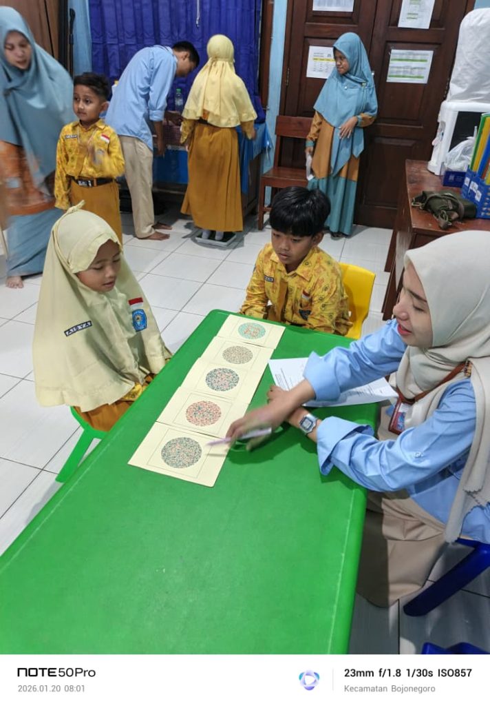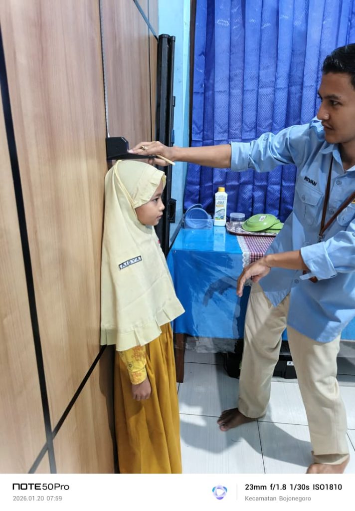 Adapun pemeriksaan kesehatan yang dilakukan meliputi cek kesehatan umum, pengukuran tinggi badan dan berat badan, serta tes mata. Pemeriksaan ini bertujuan untuk mendeteksi sejak dini kondisi kesehatan siswa, termasuk pertumbuhan fisik dan kesehatan penglihatan yang sangat berpengaruh terhadap aktivitas belajar di kelas.